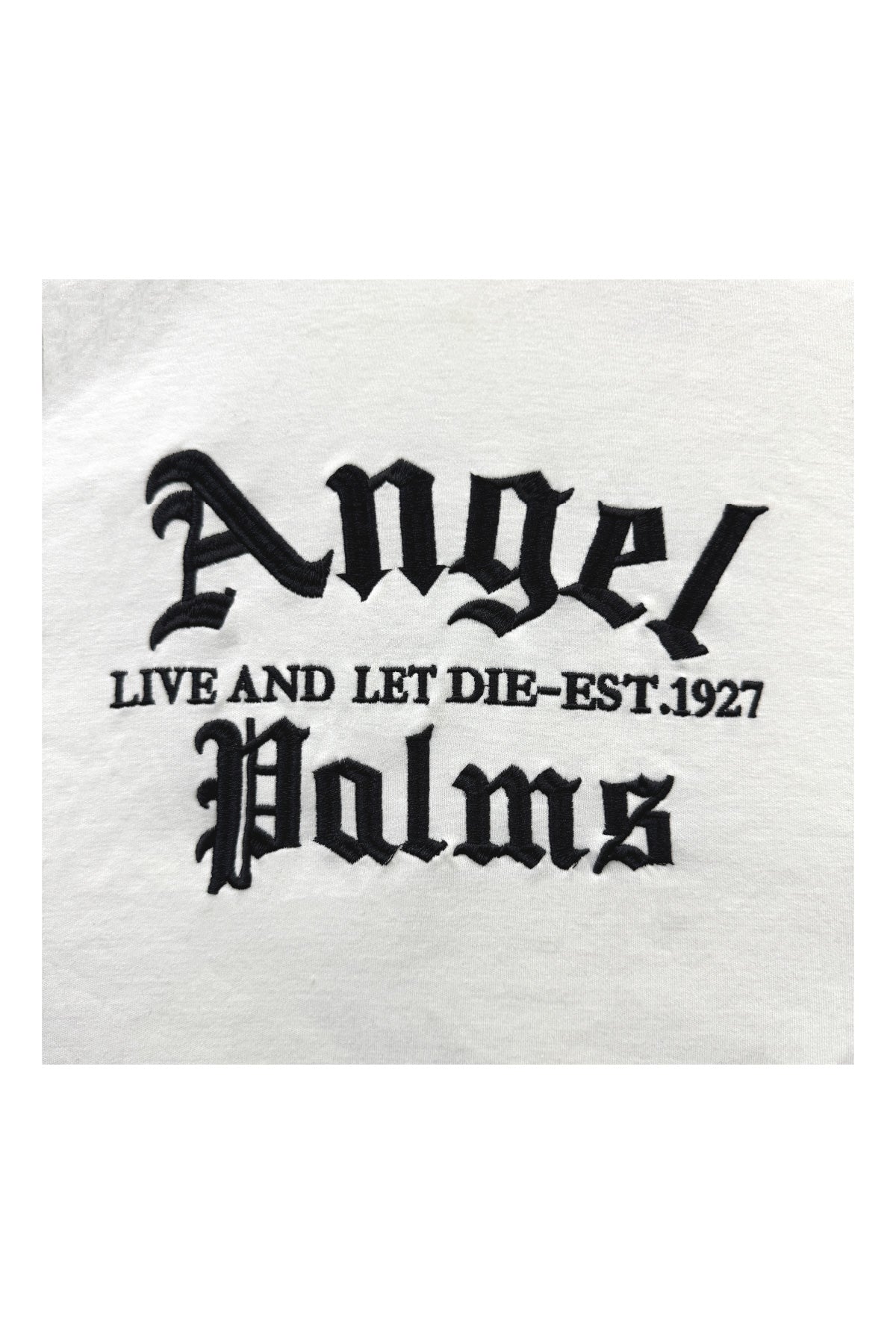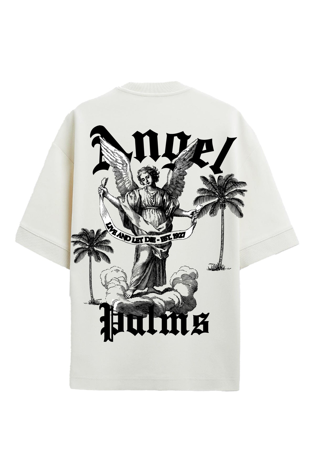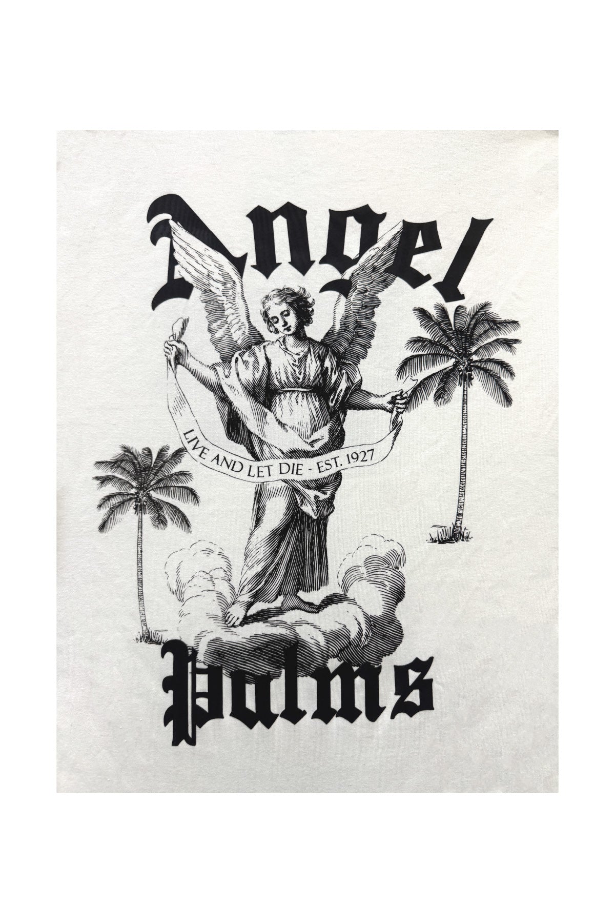 The design features striking front embroidery and print with the text “Angel Palms – Live and Let Die – Est. 1927”, while the back showcases a powerful graphic of an angel framed by palm trees, rendered in detailed monochrome. This bold composition creates a statement piece that blends vintage influences with a modern urban edge.