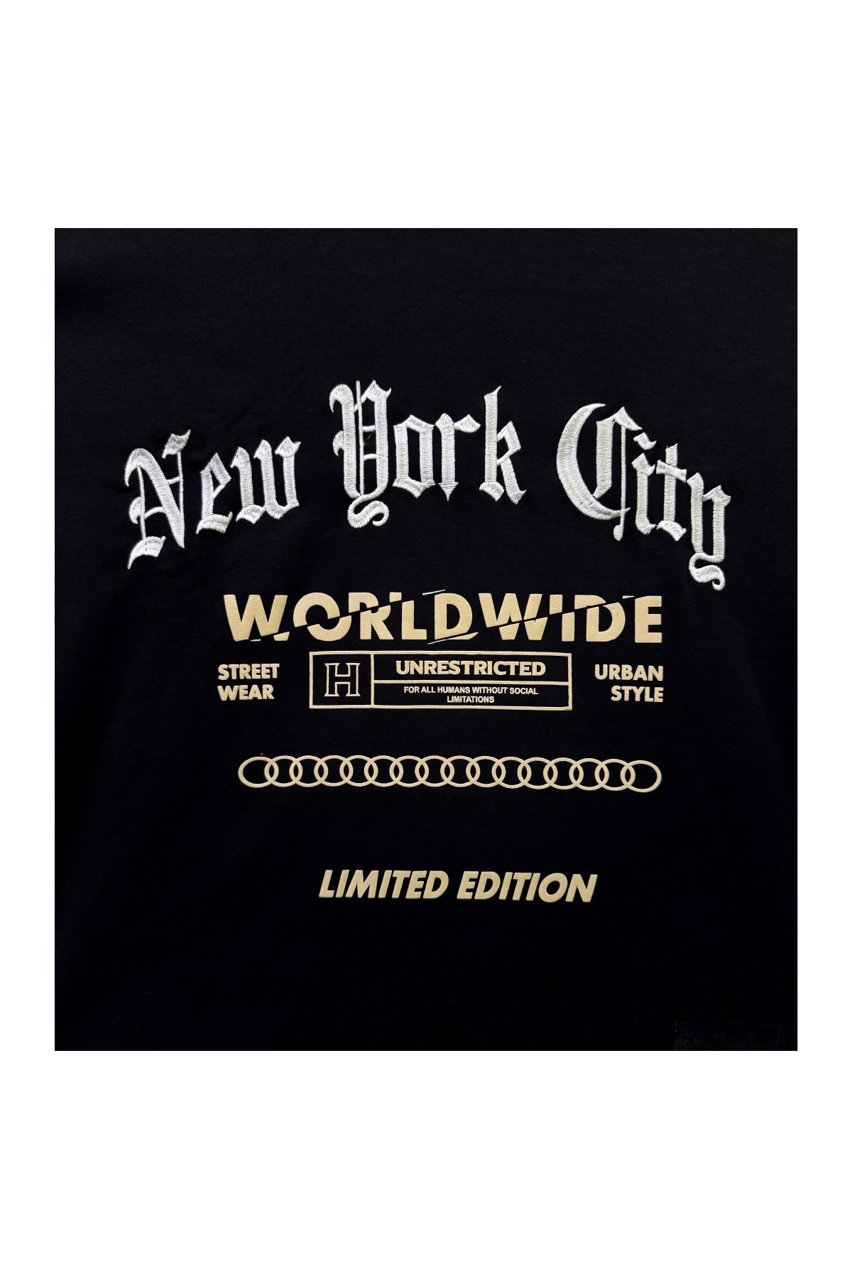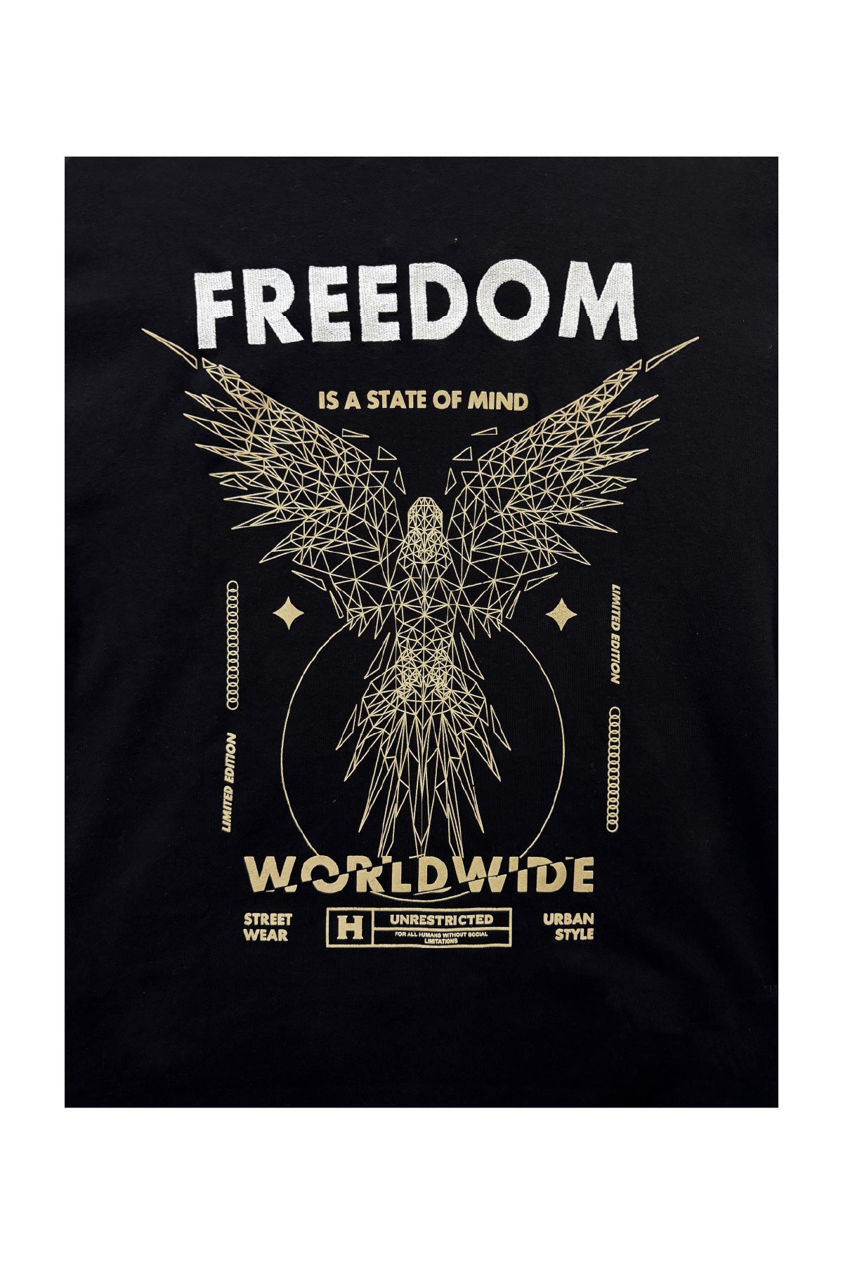 The standout design features a commanding back graphic of a geometric eagle with wings spread wide, paired with the text “FREEDOM IS A STATE OF MIND”. Metallic-inspired detailing enhances the powerful motif, making it a statement piece. The front design highlights bold “New York City” typography with urban-style elements and Limited Edition details, tying together global streetwear energy.
