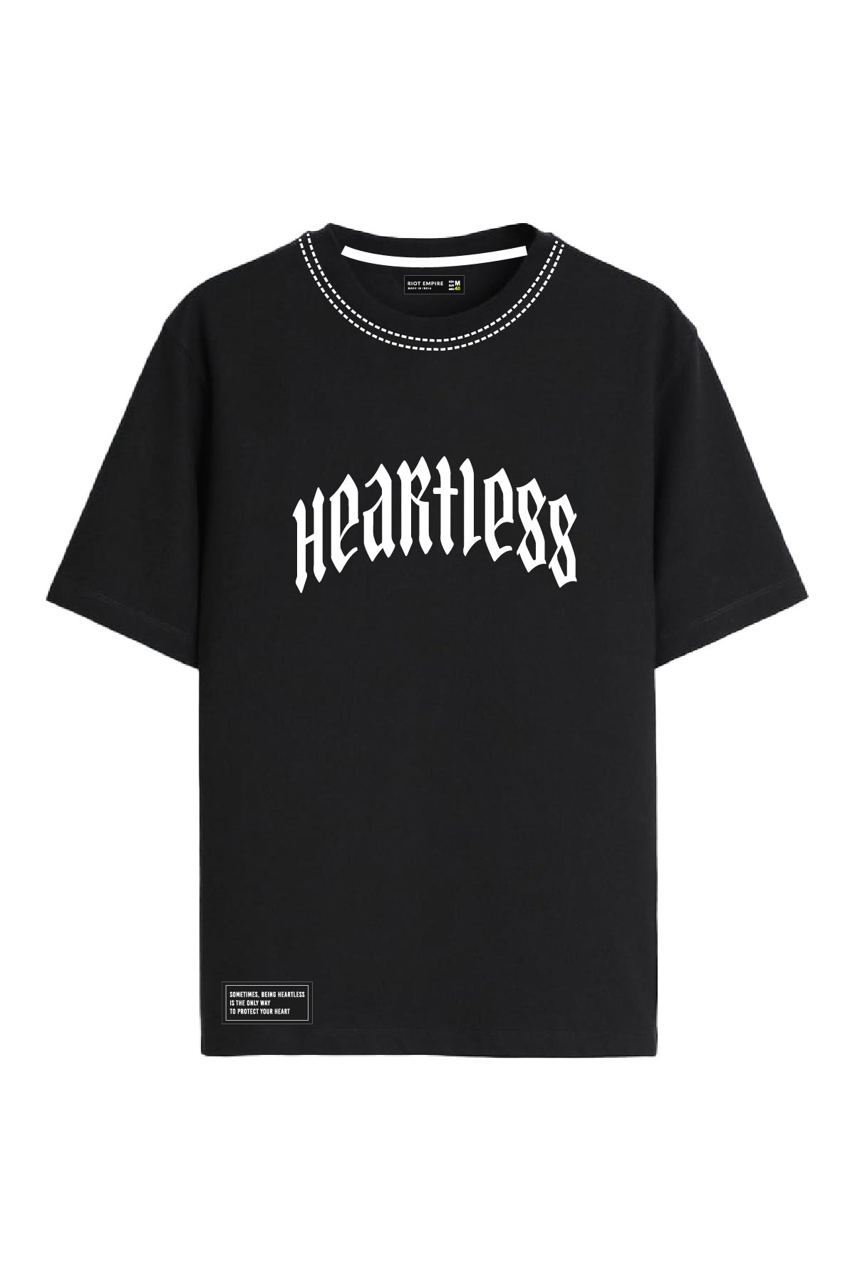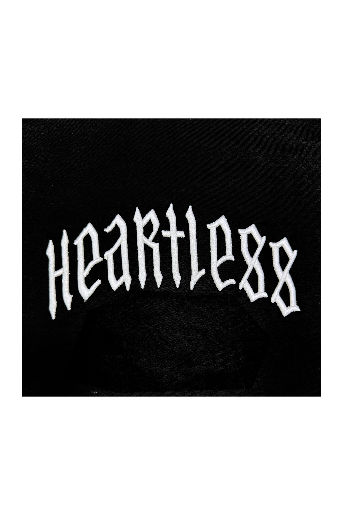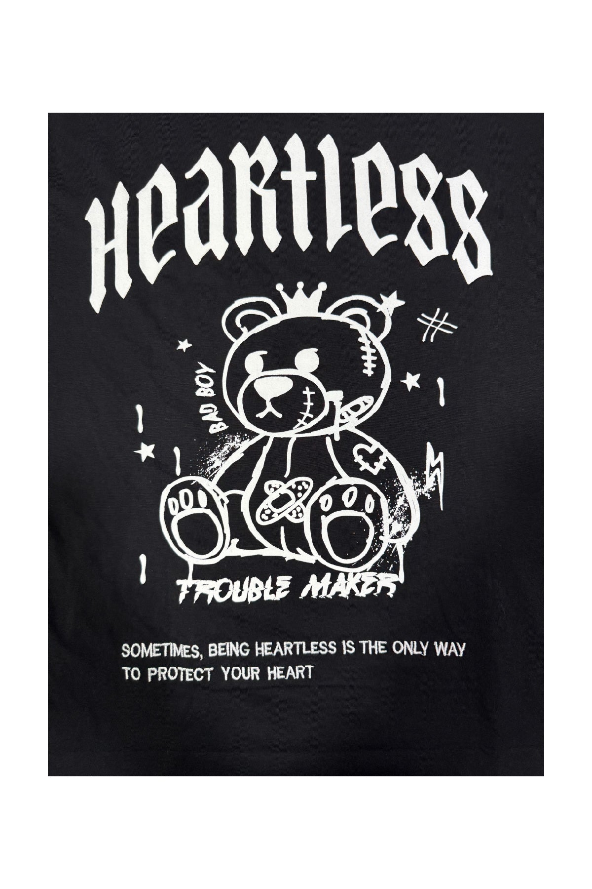 Featuring puff print and embroidery, the striking front and back graphics highlight the rebellious "Heartless" statement with a bold teddy bear artwork that stands out. A statement piece designed for those who move with attitude.