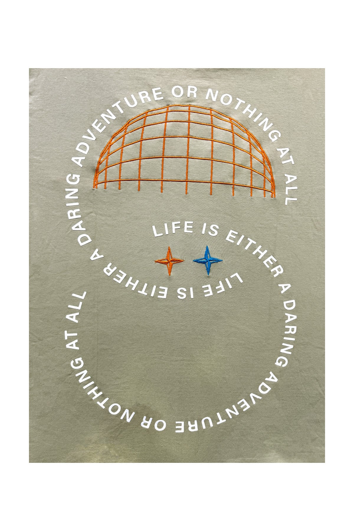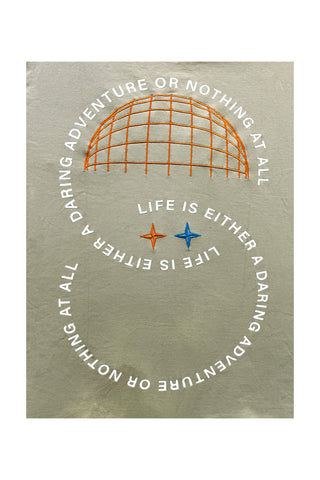 The standout design features embroidery and non-PVC print detailing across the front and back. The back showcases a bold circular globe-inspired motif with the quote “Life is either a daring adventure or nothing at all”, adding an adventurous edge to your look.