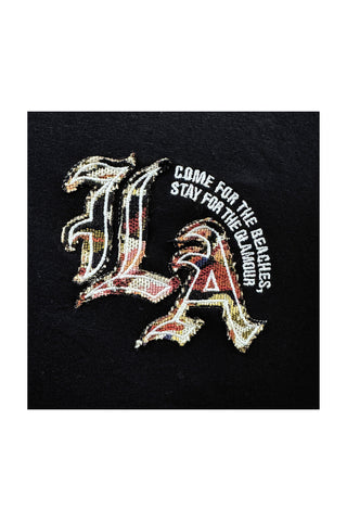 Detailed with applique embroidery and non PVC print, the bold LA-inspired front and back graphics embody the energy of Los Angeles street culture. A standout piece for those who want to carry West Coast vibes in every outfit.