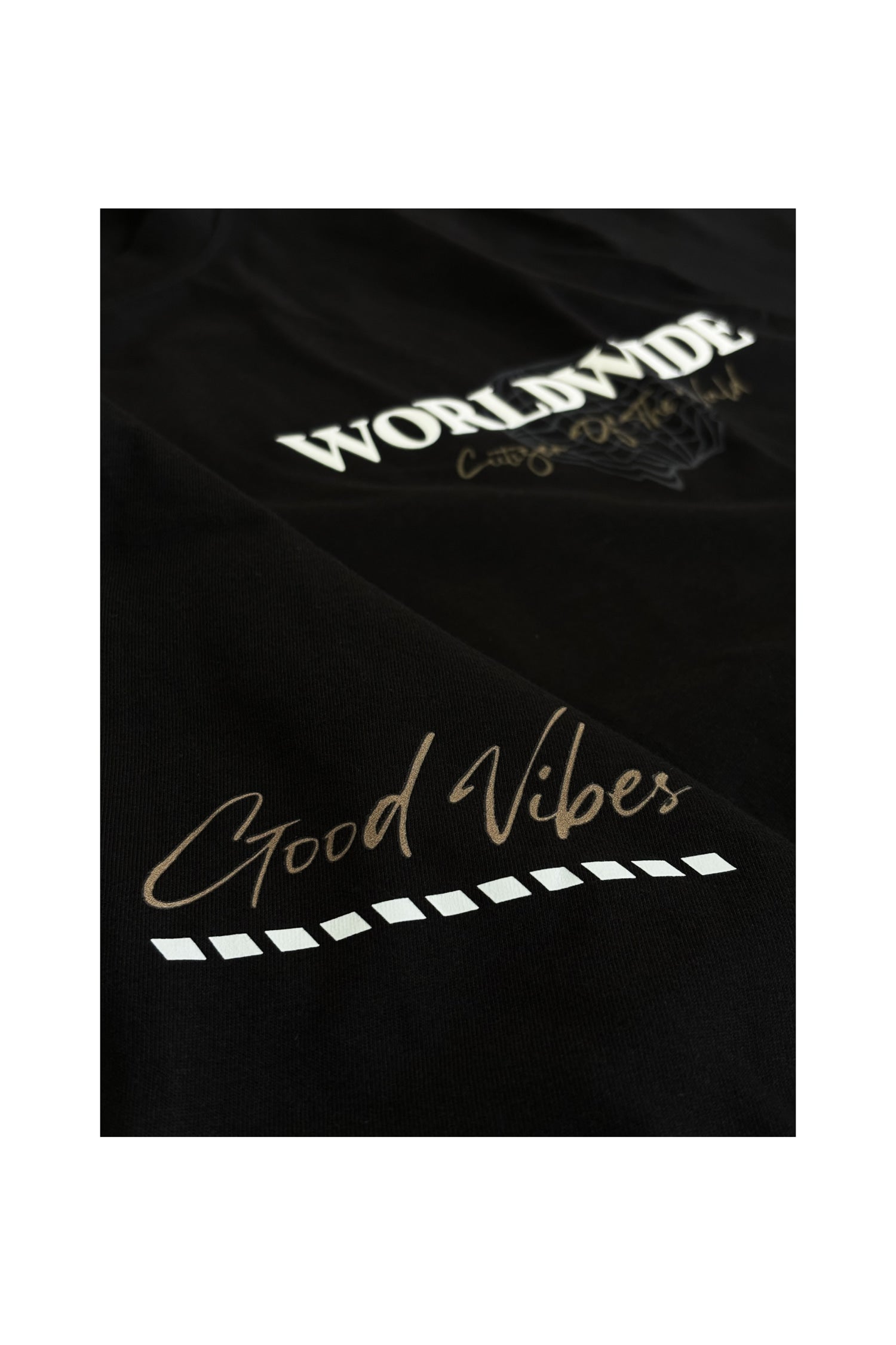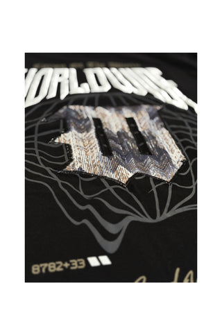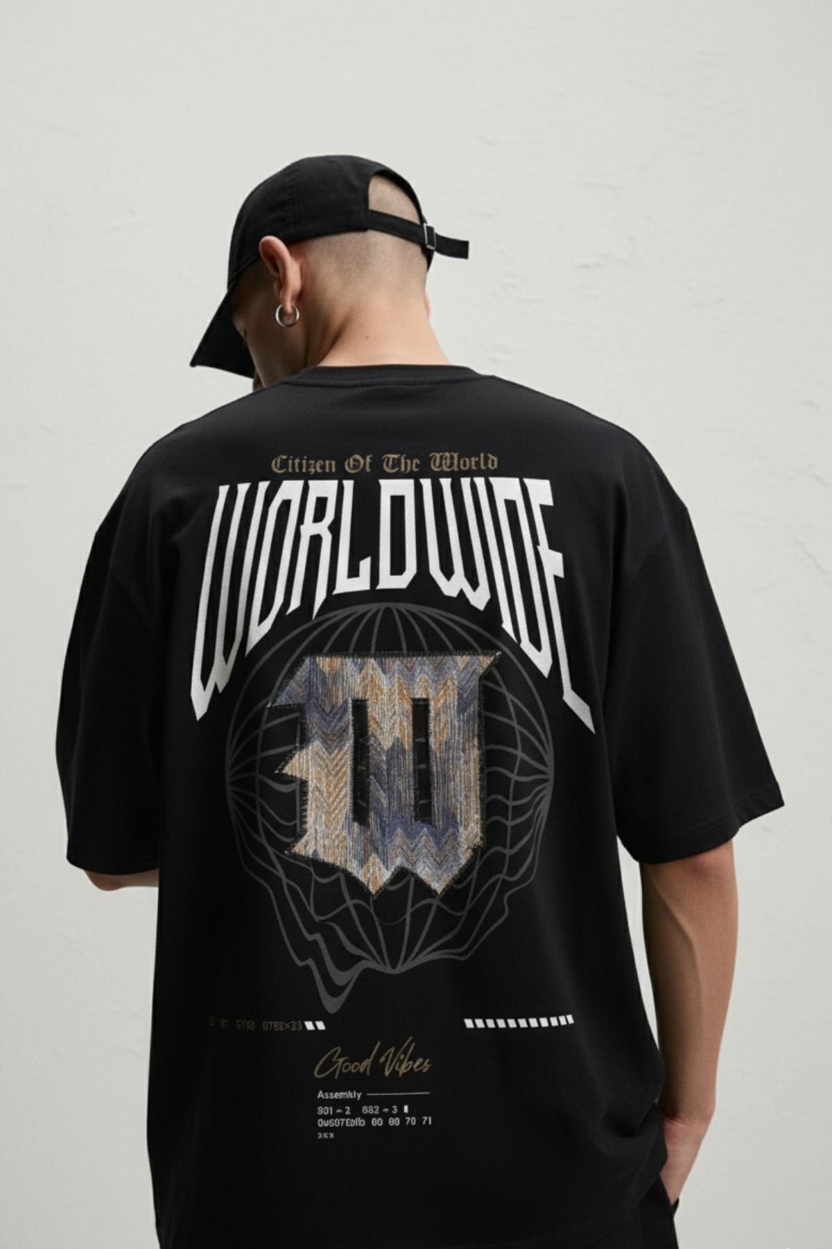 The front features embroidery details with a clean Worldwide logo, while the back showcases a standout patch embroidery and HD print graphic, giving it a streetwear edge.
