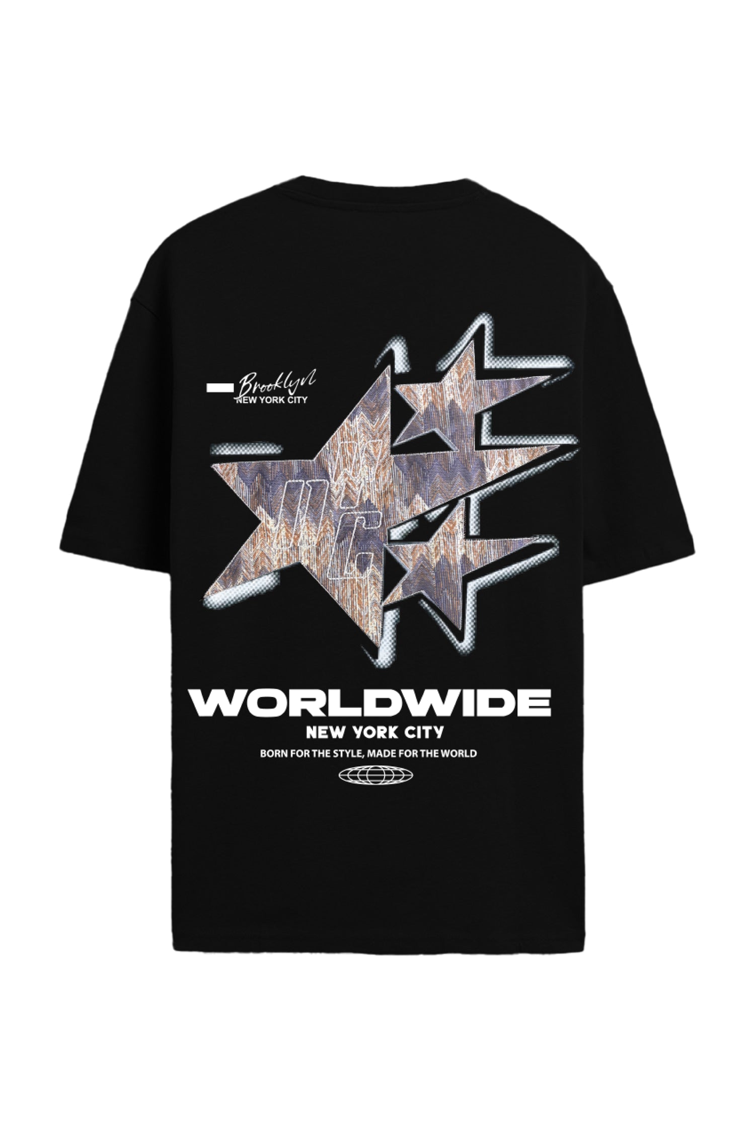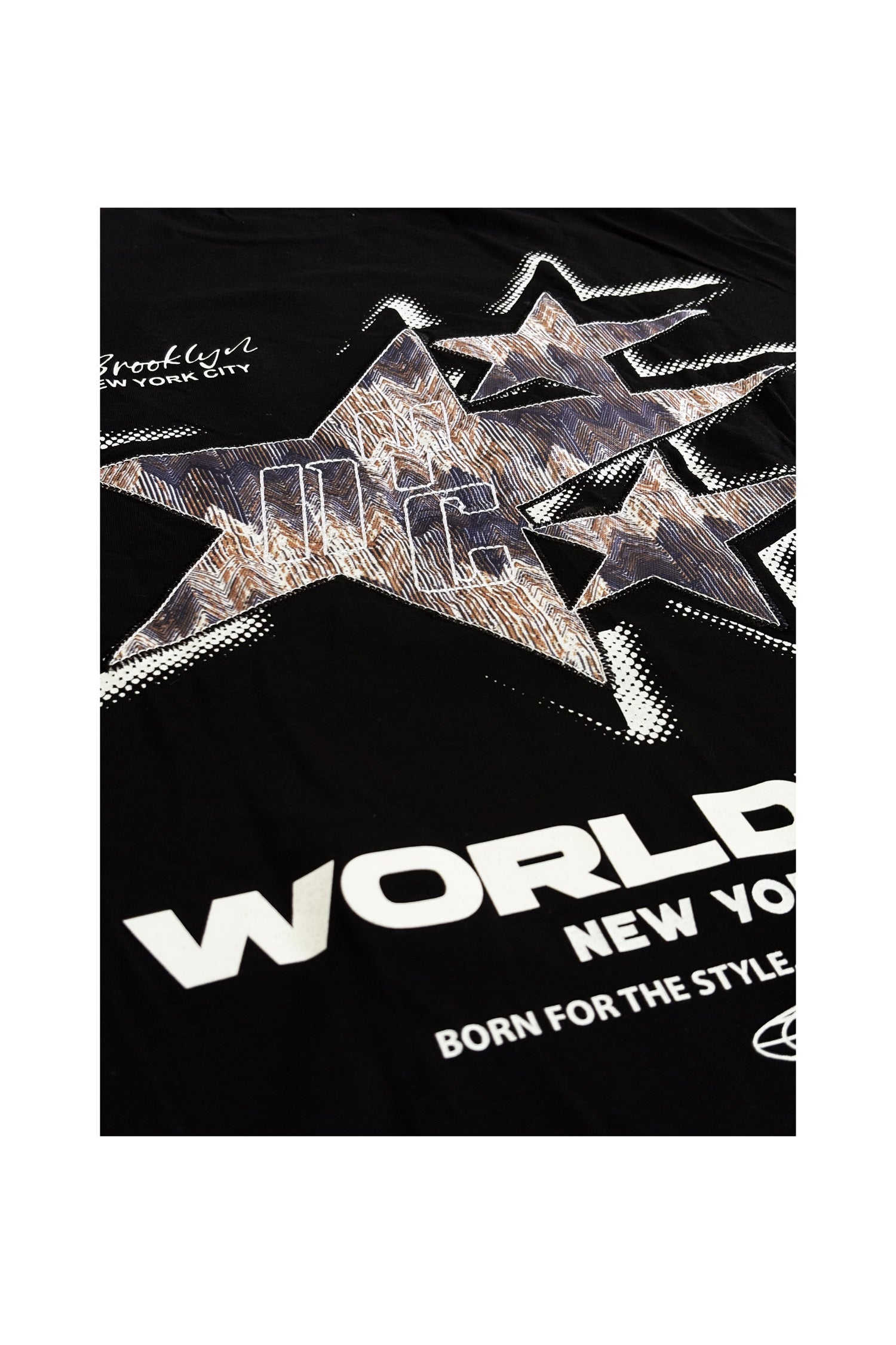 The front carries a minimal embroidered “Brooklyn New York City” detail, while the back features oversized star patch embroidery combined with striking HD and non PVC print graphics. Built for statement-making streetwear looks, this tee merges craftsmanship with urban attitude.