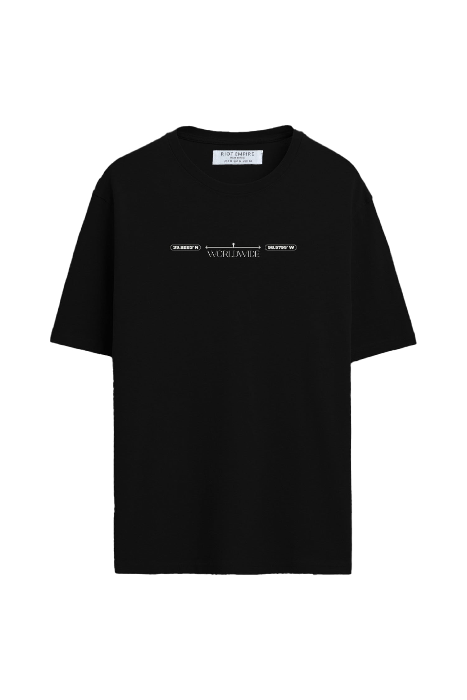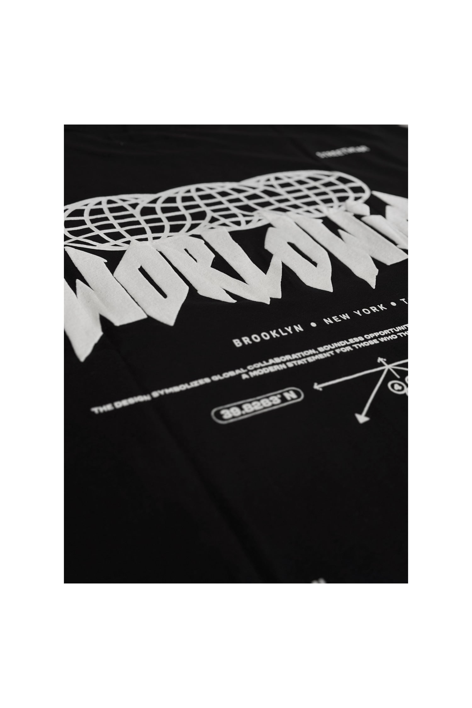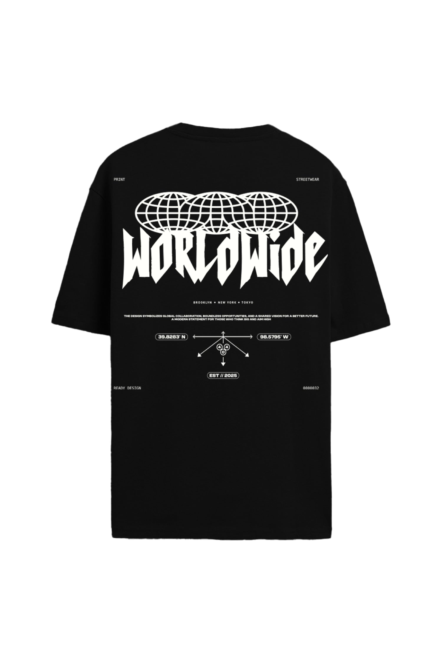 The front features subtle embroidery with a clean “Worldwide” logo, while the back makes a statement with oversized globe-inspired puff print and graphic detailing. Finished with embroidery, puff print, and non PVC print techniques, this tee balances streetwear edge with premium craftsmanship.