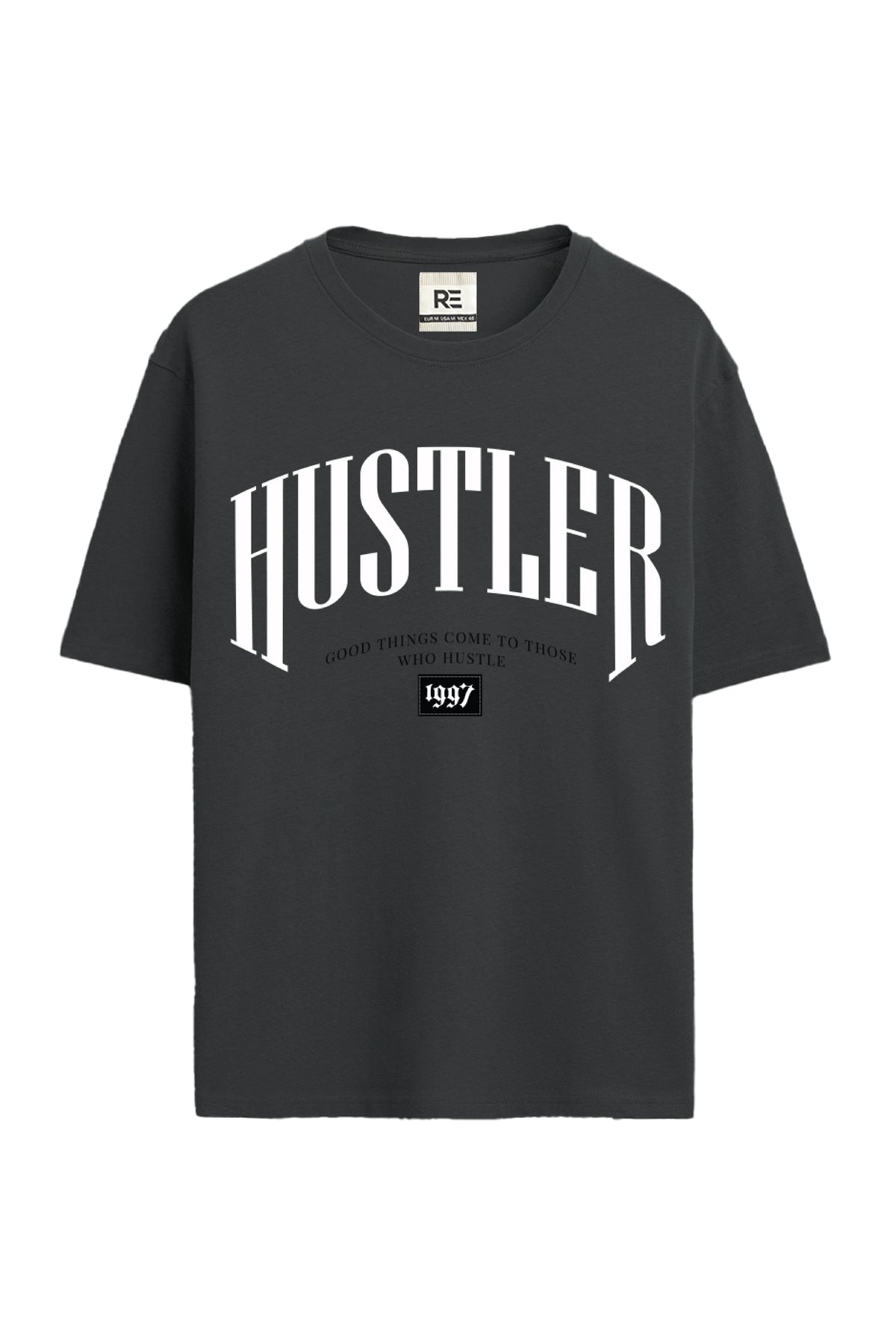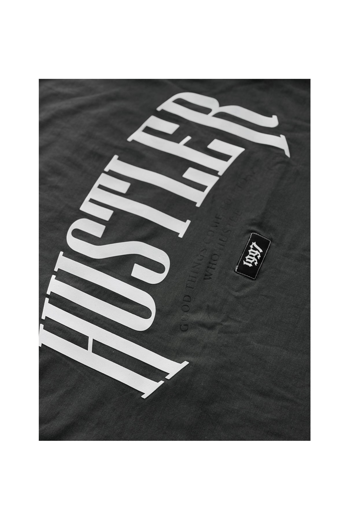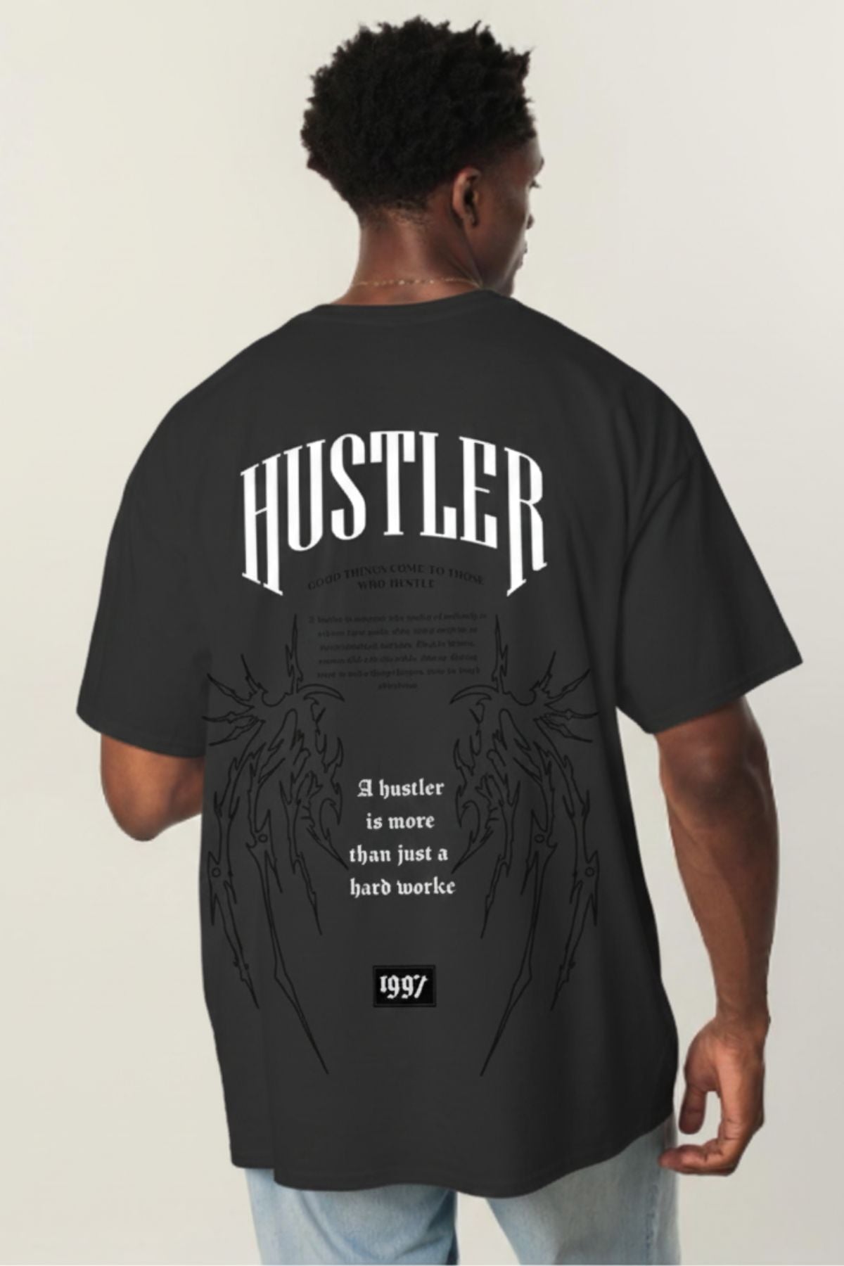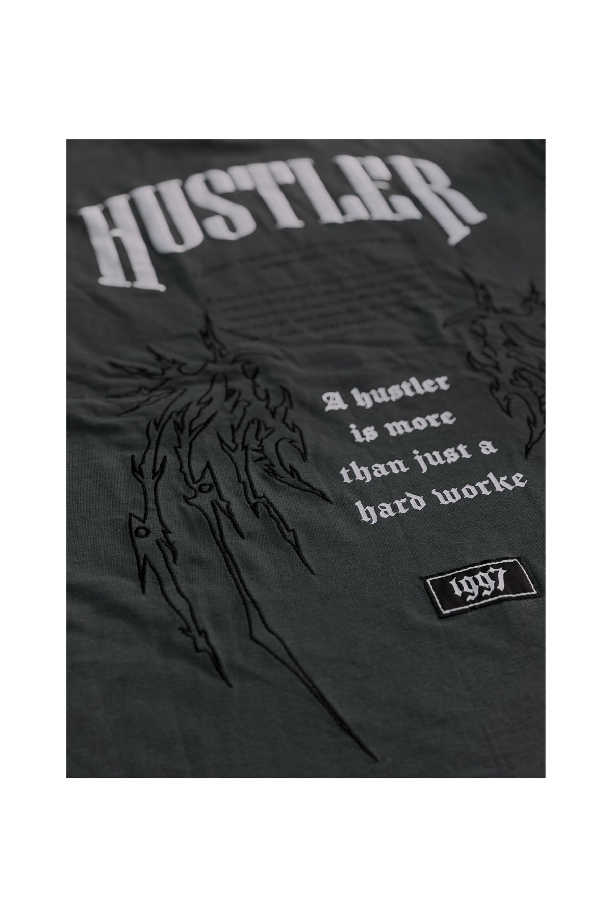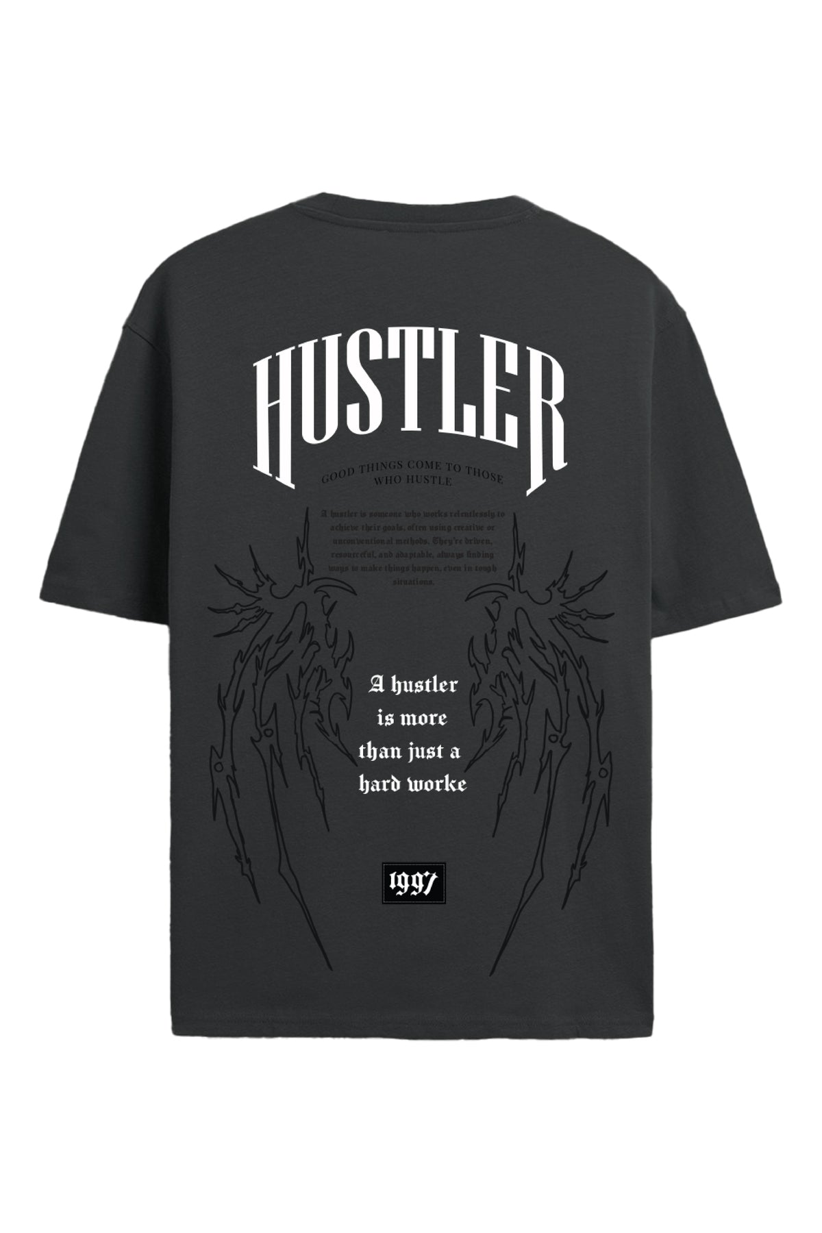 This piece features a mix of HD print, non PVC print, and embroidery, creating depth and contrast across its front and back. The “Hustler” typography and bold back graphics embody a confident, determined streetwear spirit that stands out in any crowd.