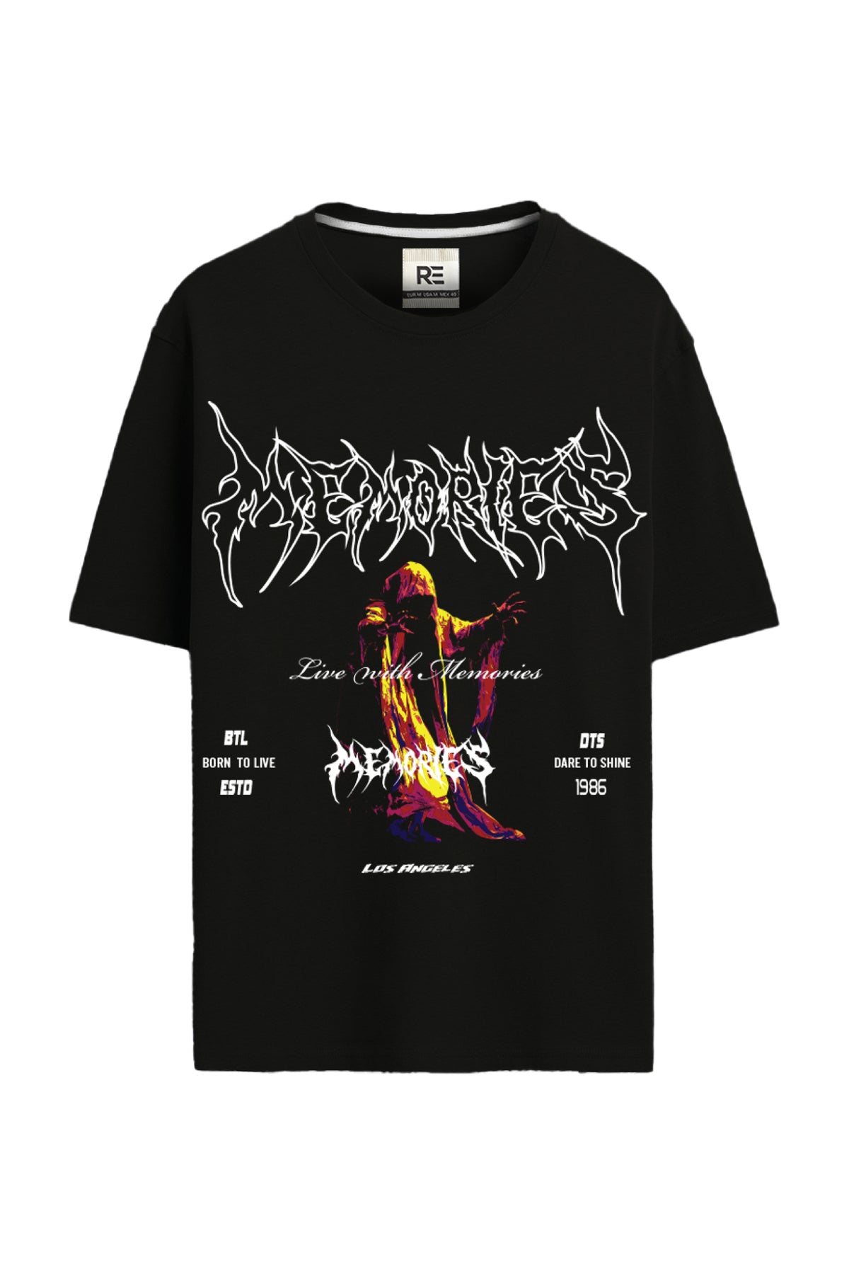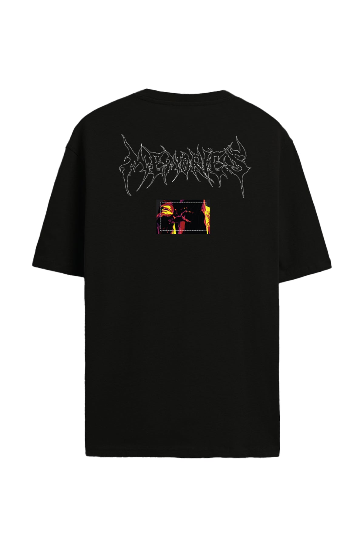 Featuring high-definition digital print and embroidery, the design showcases the striking "Memories" artwork across the front and back, accented with a vivid abstract graphic. With its edgy typography and statement visuals, this tee captures a rebellious, modern streetwear vibe.
