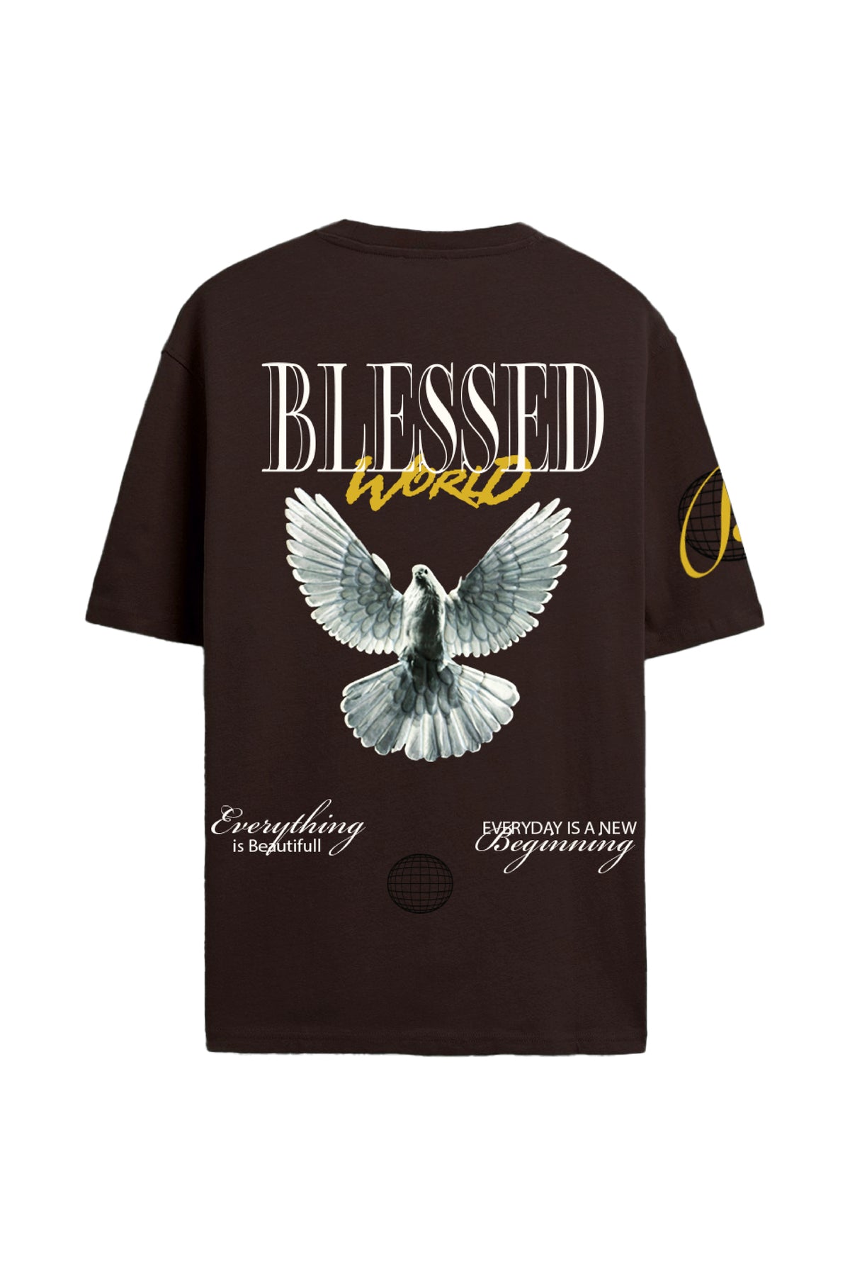 The design features high-definition digital print, embroidery, and bold HD print details. On the front, subtle text and emblem accents set the tone, while the back showcases a striking dove graphic with “Blessed World” typography and inspirational messages. This fusion of bold visuals and meaningful text embodies positivity and modern streetwear culture.