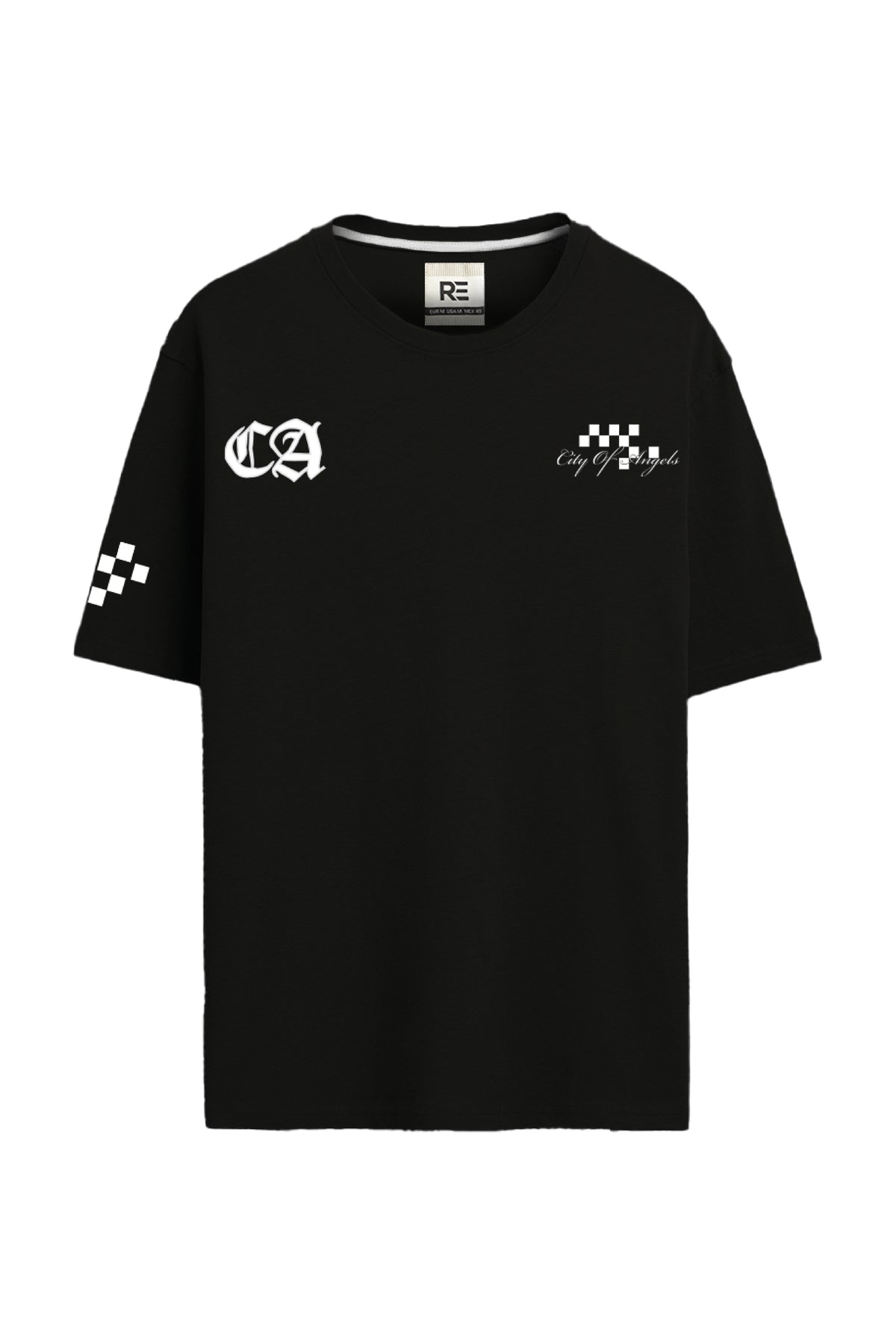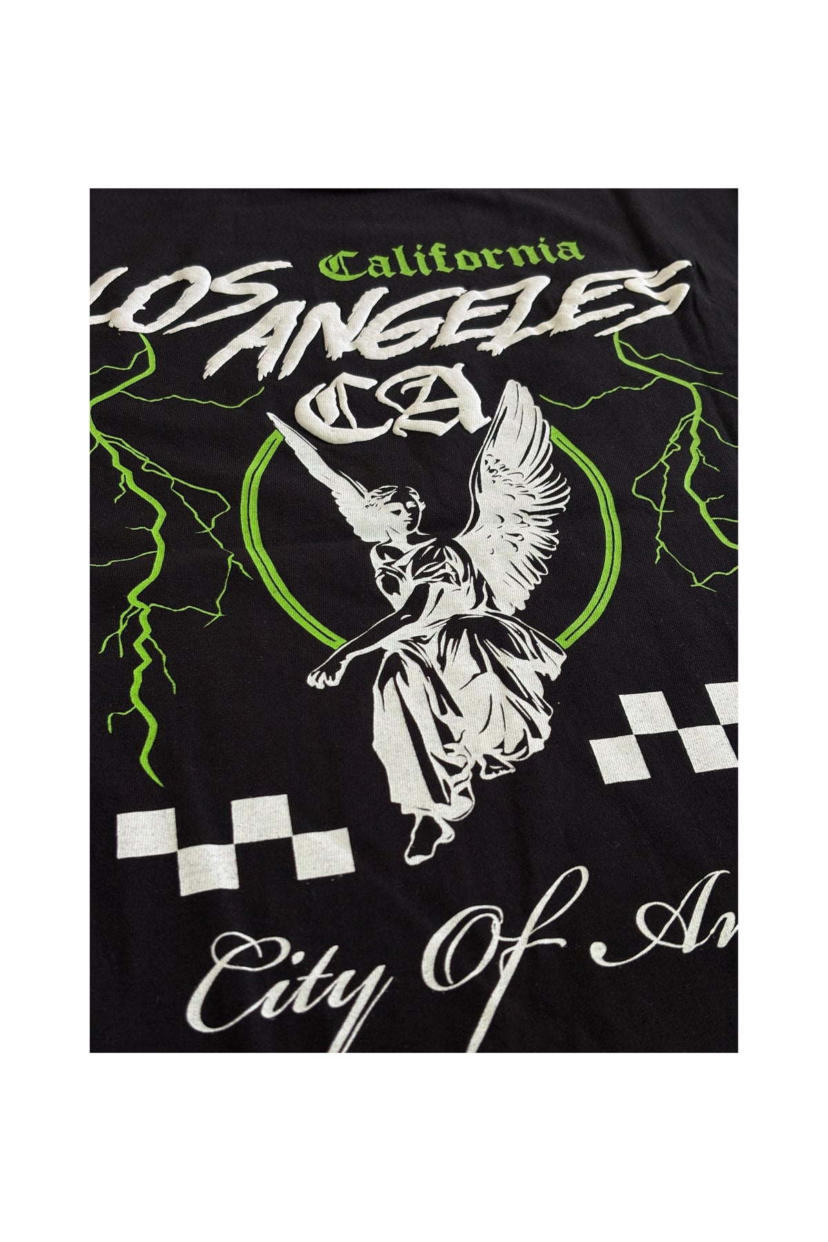 This tee features high-definition prints, embroidery, and non-PVC printing techniques that highlight the bold City of Angels artwork. The front showcases minimal yet edgy typography with CA and checkered accents, while the back displays an angelic figure surrounded by striking graphics and vibrant lightning motifs.