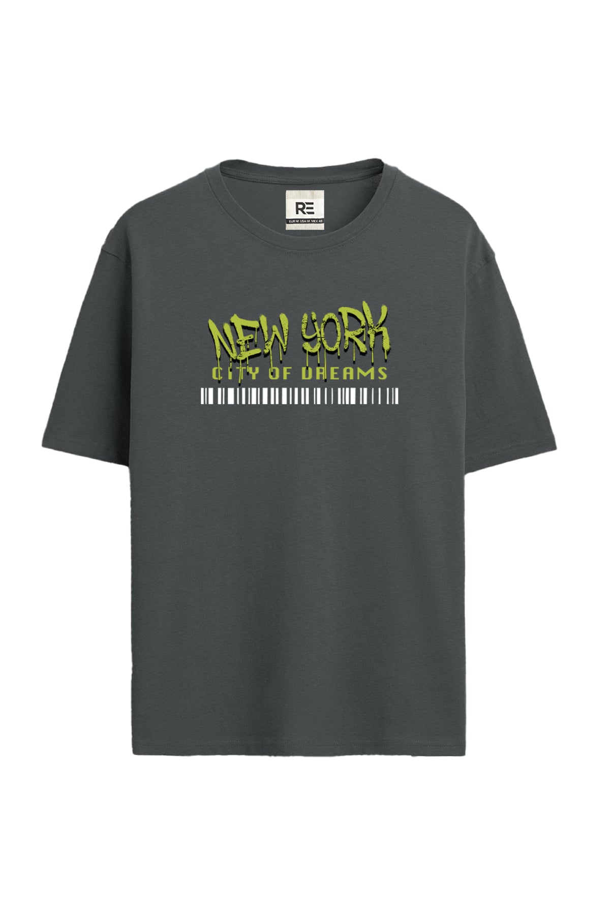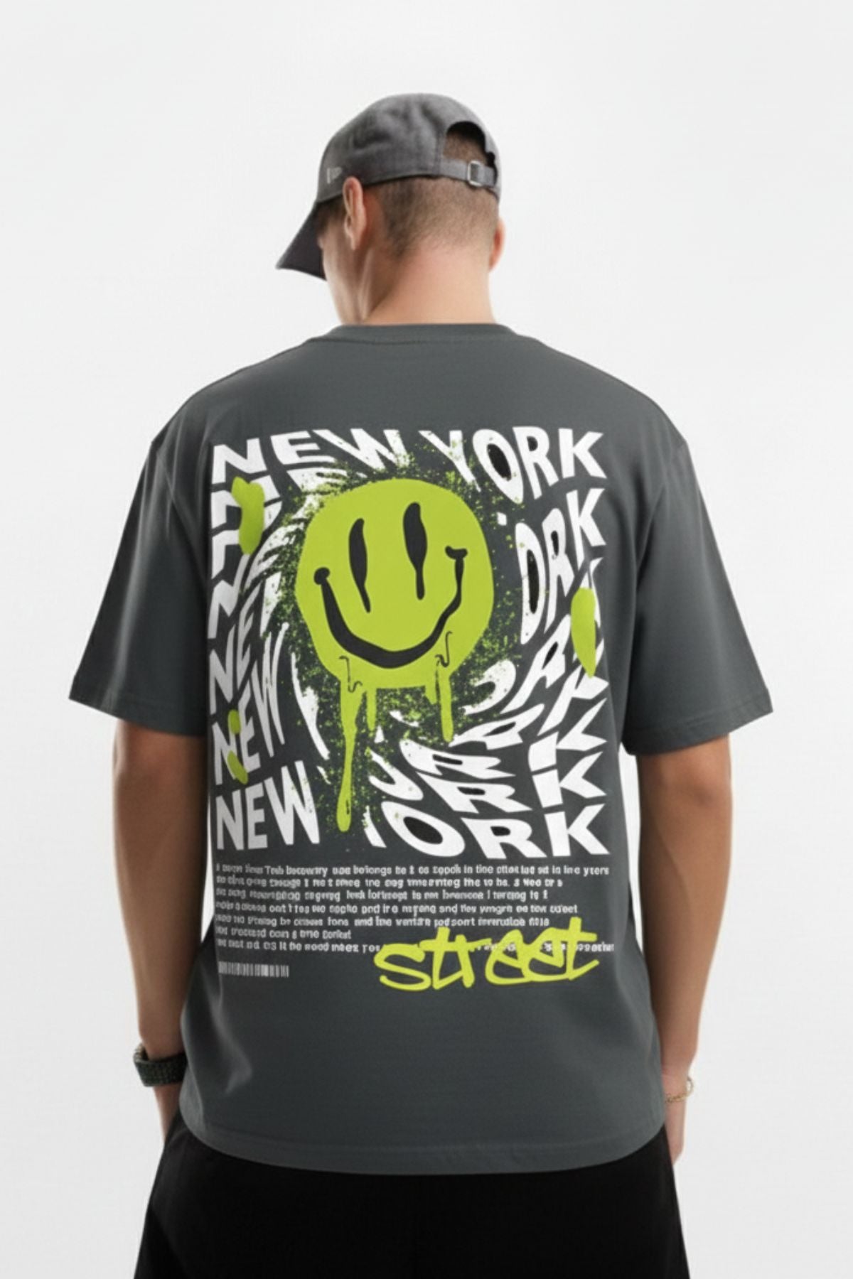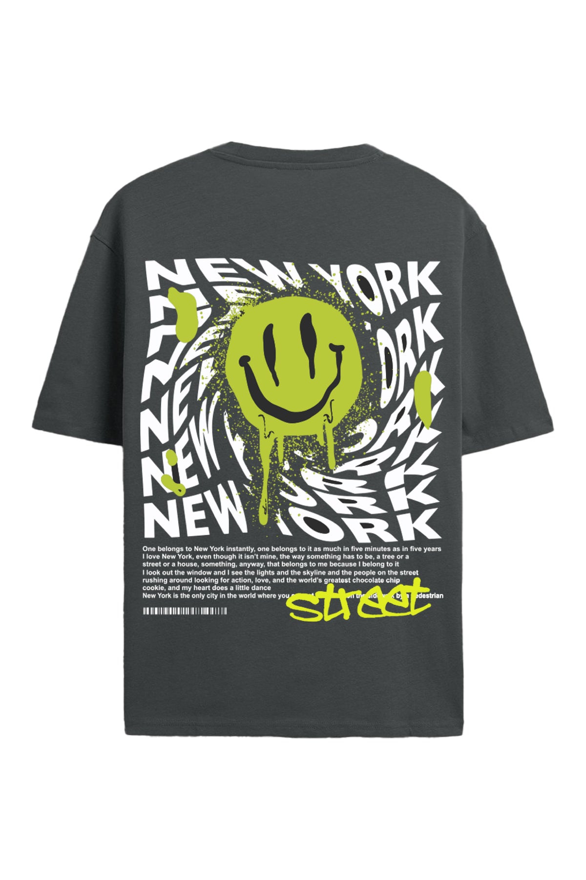 The standout graphic features a striking graffiti-inspired “New York” typography paired with a vibrant dripping neon smiley, giving the tee a rebellious and urban edge. Accents like barcode and slogan detailing emphasize its gritty, street-ready attitude. Perfect for making a statement in any casual lineup.
