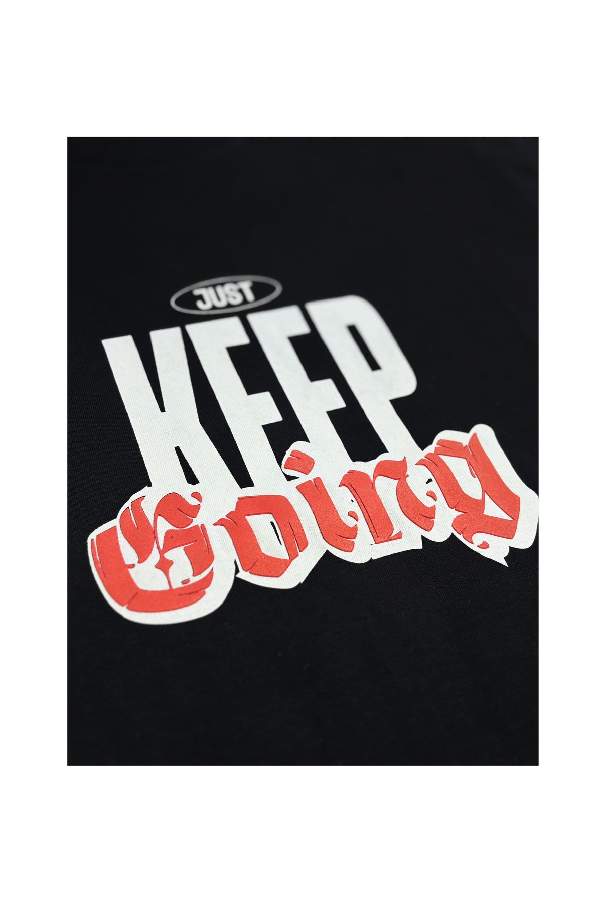 The front features a clean yet impactful layout with the statement “Just Keep Going” in a mix of modern block lettering and gothic-inspired typography, blending motivation with street culture aesthetics.