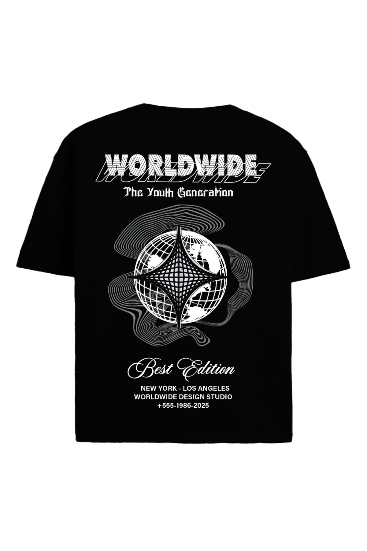 The chest features a striking WORLDWIDE graphic with a unique patterned texture, paired with NEW YORK – LOS ANGELES to highlight iconic city culture. Finished with high-quality non-PVC printing, it blends minimal design with urban attitude perfect for everyday wear.