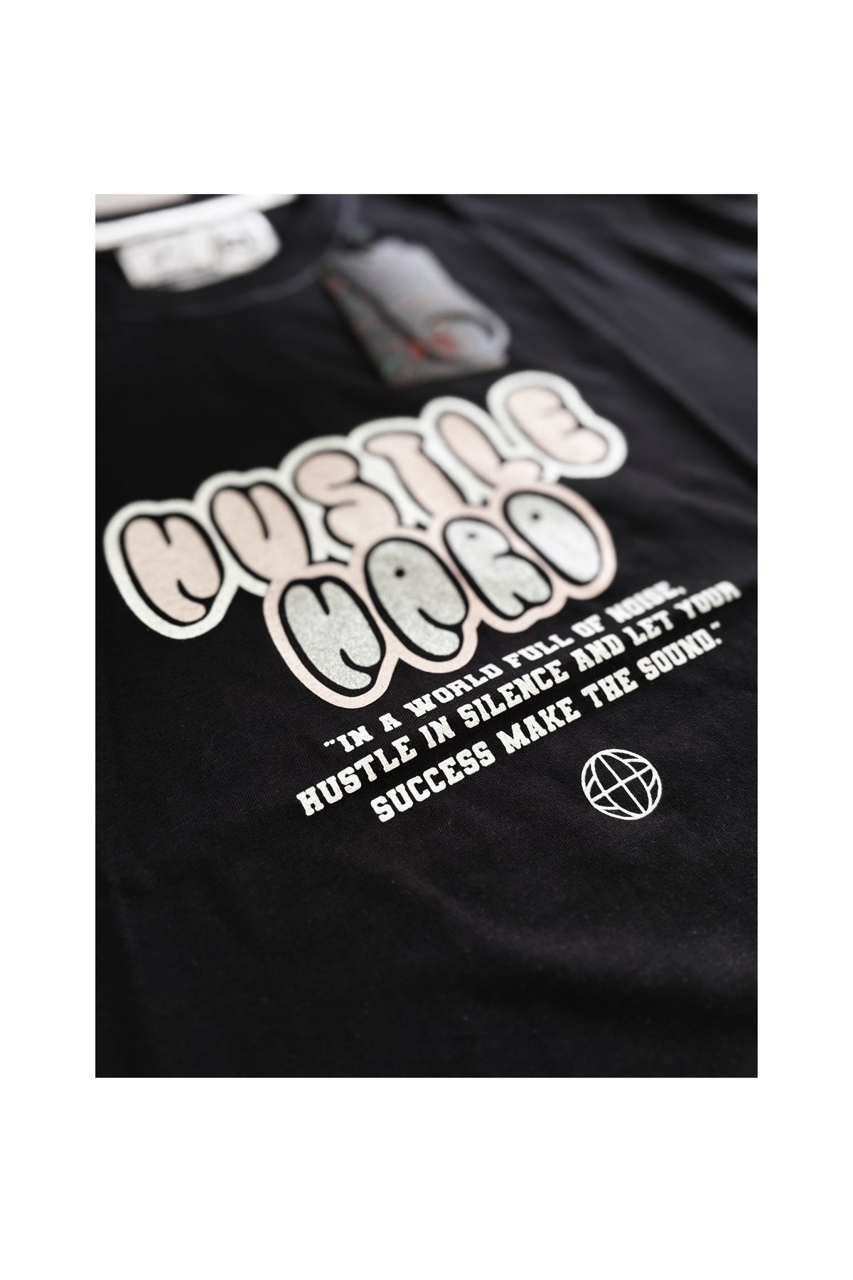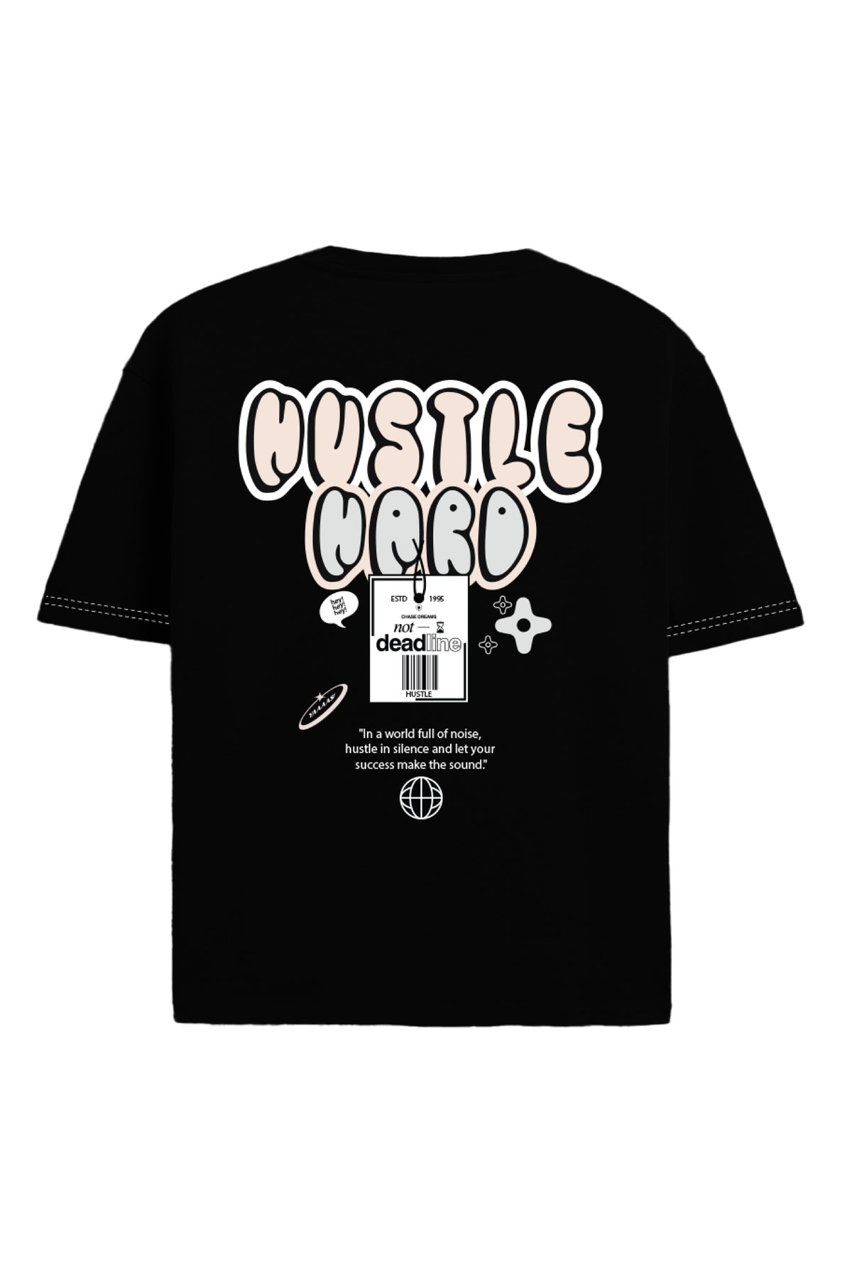 The front showcases a playful bubble-letter Hustle Hard graphic paired with an inspiring quote: