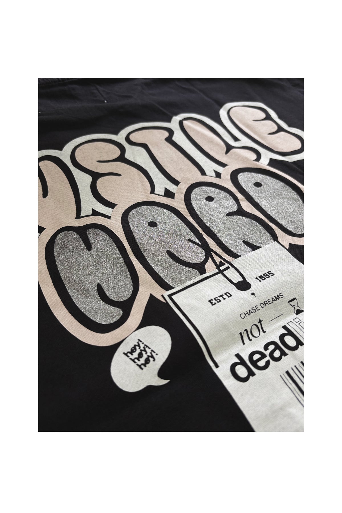 The back elevates the look with expanded artwork oversized bubble text, creative doodle-style elements, barcode-inspired graphics, and a motivating “not deadline, chase dreams” theme. Every detail is printed using premium non-PVC ink for sharper lines, durability, and a clean finish.