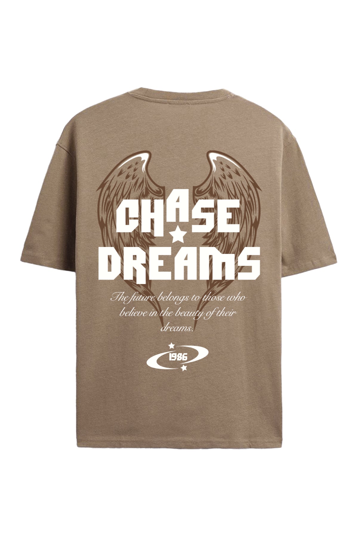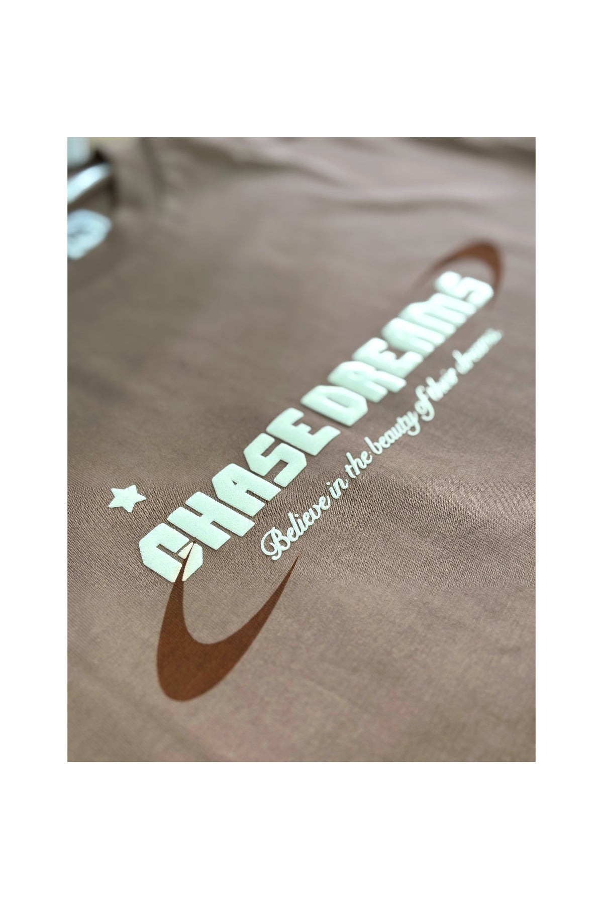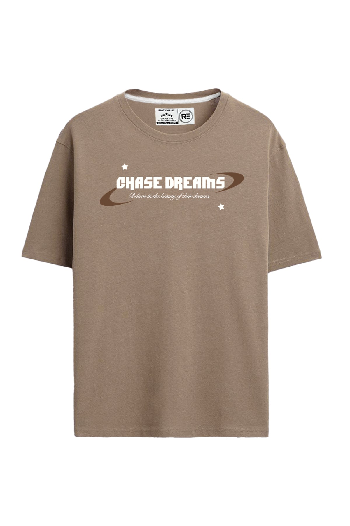 The chest features a striking CHASE DREAMS graphic wrapped in a planet-ring design, paired with the inspiring quote “Believe in the beauty of their dreams.” Accented with minimal star elements, this tee blends cosmic style with uplifting energy perfect for those who dream big and move with purpose.