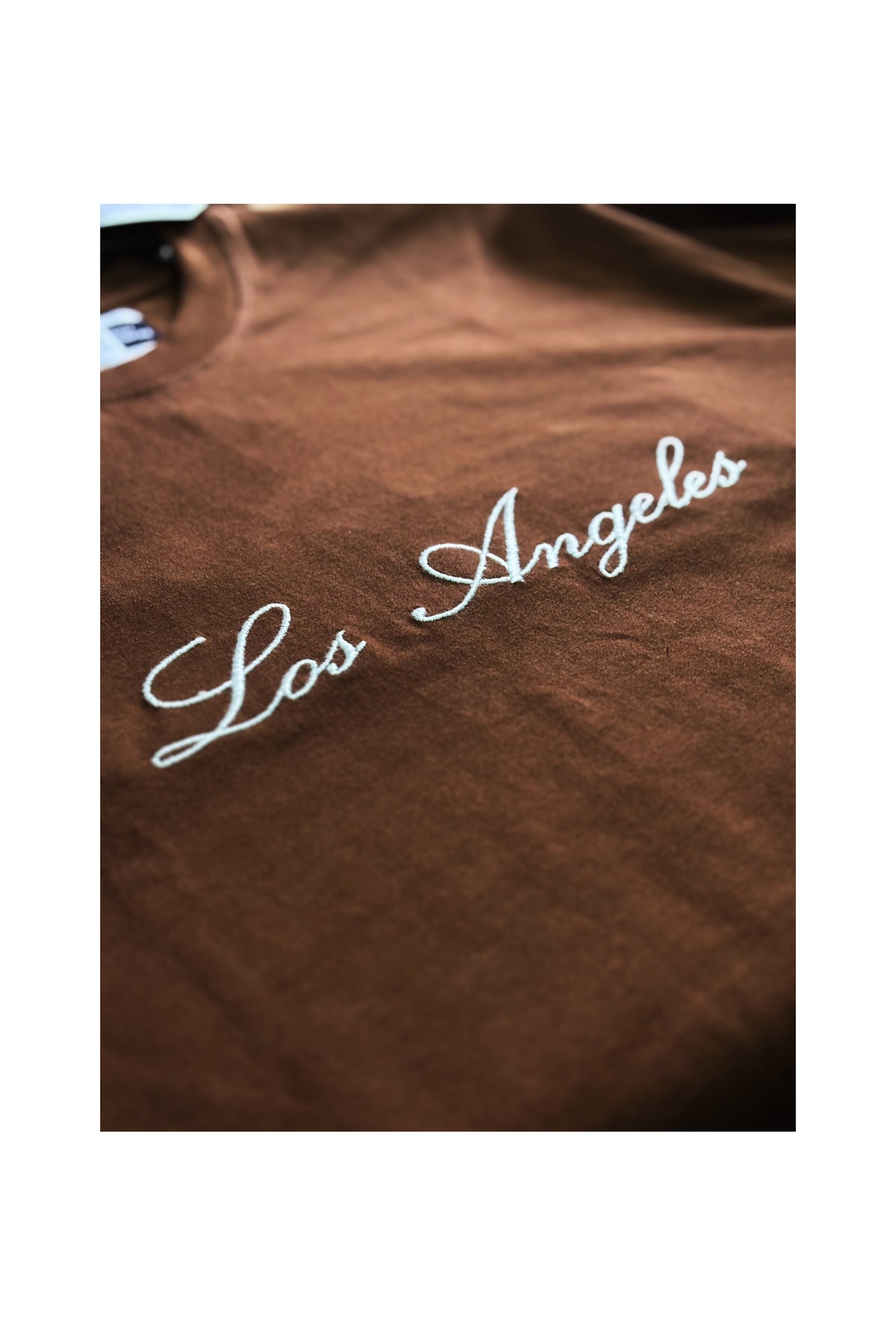 This brown short-sleeve t-shirt features a clean and elegant design with the words “Los Angeles” written across the chest in a stylish white cursive font. It has a classic crew neck and a relaxed, comfortable fit perfect for casual wear or adding a subtle city-inspired touch to any outfit.