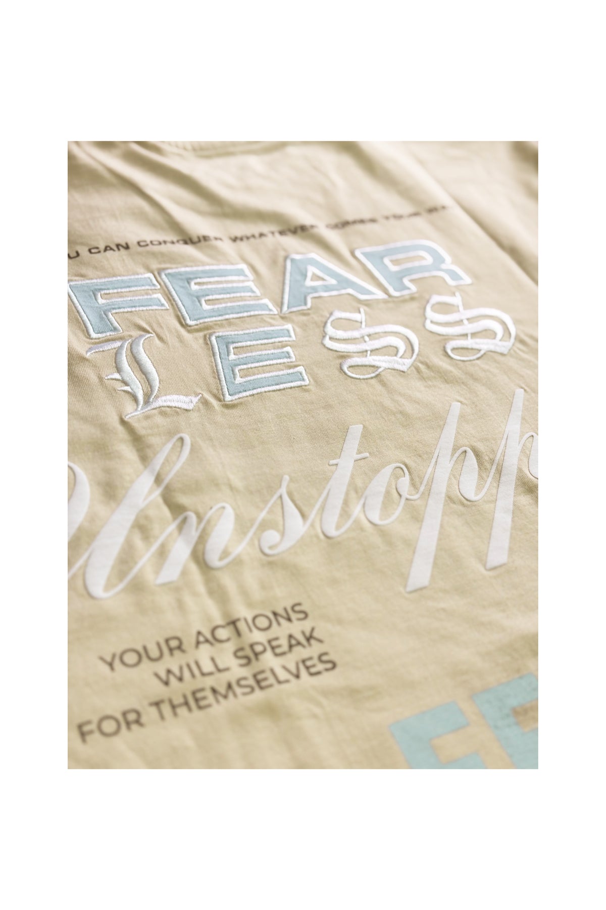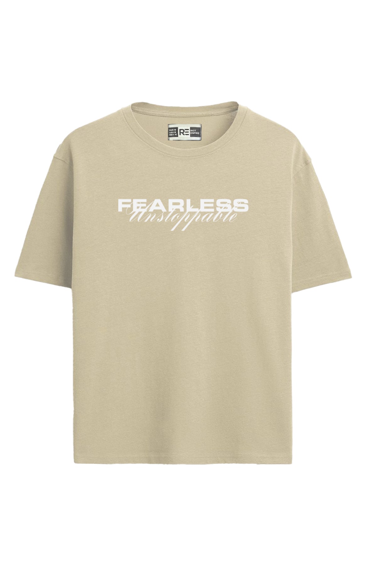 The front features the empowering Fearless Unstoppable graphic merging strong block lettering with sleek script detailing for a refined yet powerful aesthetic. Minimalist in design but impactful in attitude, this tee brings sharp clarity and premium print execution that elevates any streetwear look. Finished with high-quality non-PVC printing, it stands as a statement piece for those who move with confidence.