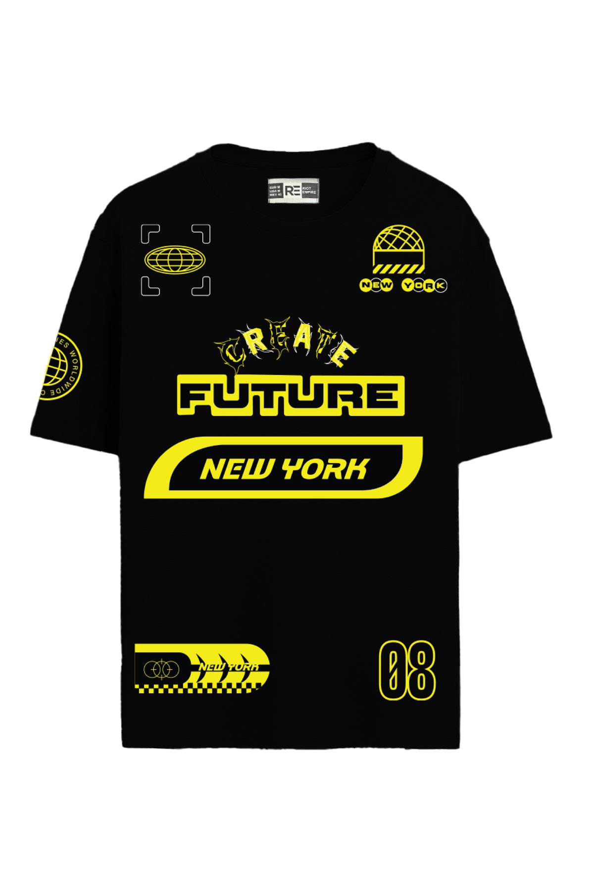 The front showcases a layered set of high-impact neon yellow graphics CREATE, FUTURE, and NEW YORK paired with futuristic globe icons, grid domes, and tech-inspired detailing. Each element is brought to life using a mix of crisp non-PVC prints for sharp definition. Additional placements on the sleeves and hem add depth, giving the tee a full 360° graphic identity that stands out from every angle.